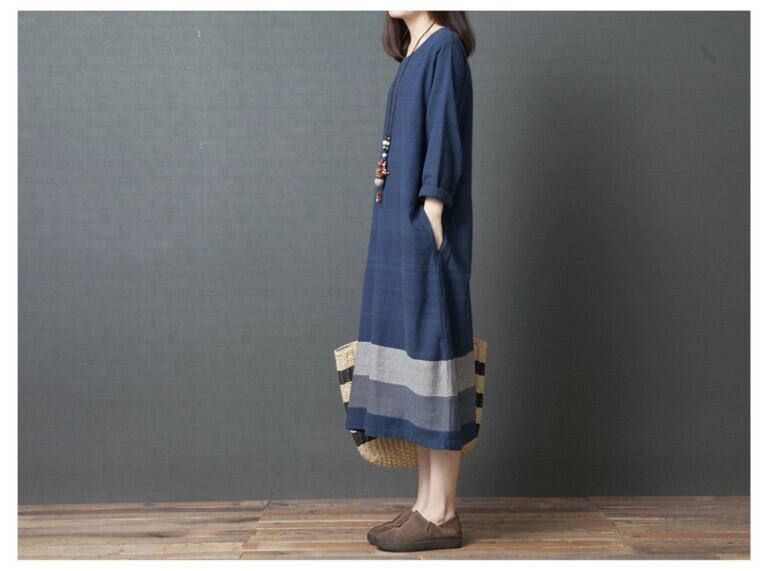 膝上の綿とリネンのドレス 2021 春と秋の新しいスタイルのゆったりとした大きいサイズの西洋風のストライプのスプライシング長袖リネンのミドル丈のスカート ロング コットン 大きめサイズ スプリング 春物 オータム 秋物 sine51975355344