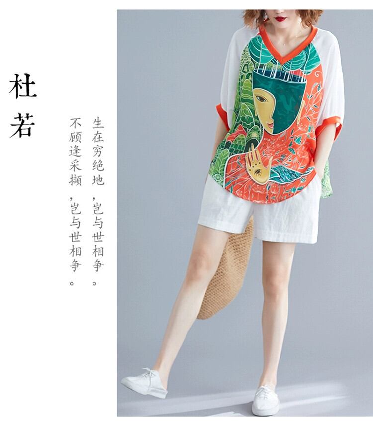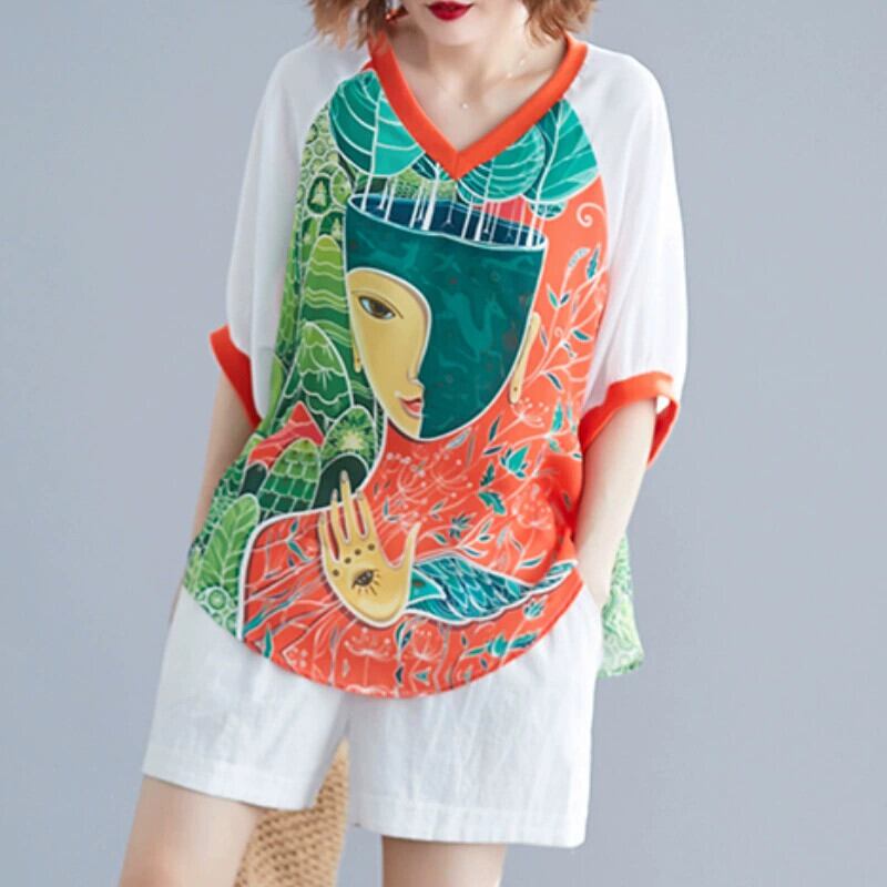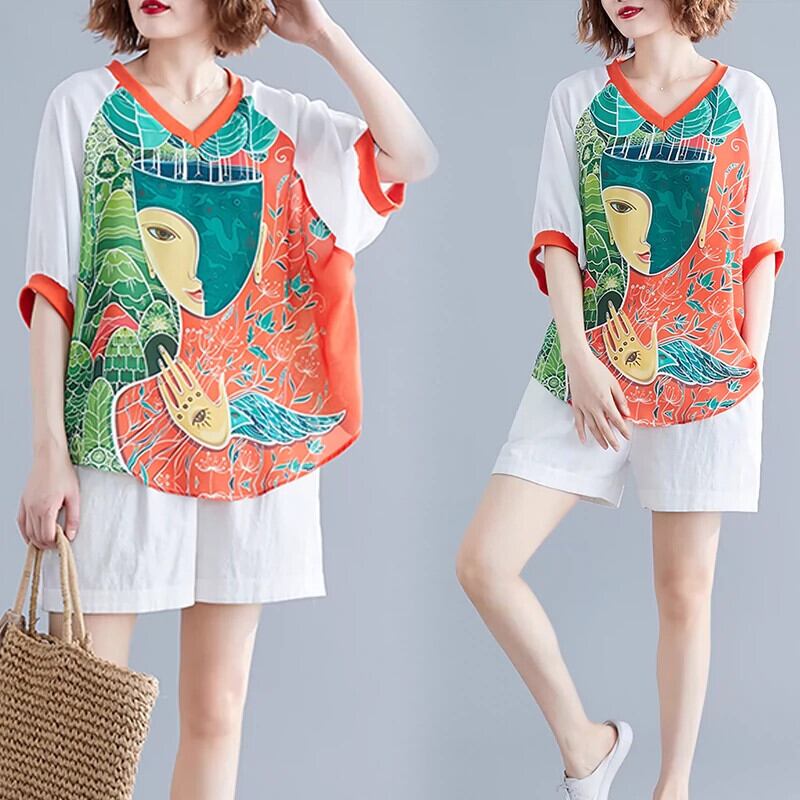 シフォンバットスリーブトップ夏ルーズプラスサイズ女性の年齢を軽減する V ネック漫画プリントお腹と痩身半袖 T シャツ 大きめサイズ サマー 夏物 Vネック Tシャツ sine86243871591