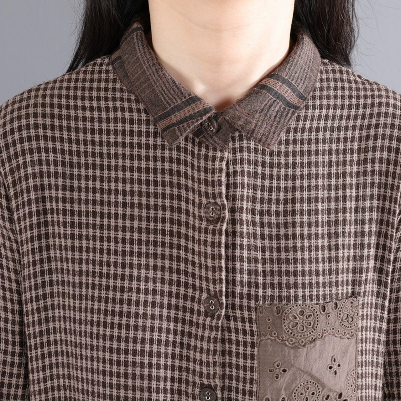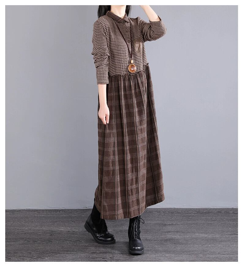 綿とリネンのドレスの女性の春と秋の緩い大きいサイズの西洋スタイルのチェック柄菌エッジスプライシングラペルリネンシャツミドル丈スカート コットン 大きめサイズ スプリング 春物 オータム 秋物 sine13943707422