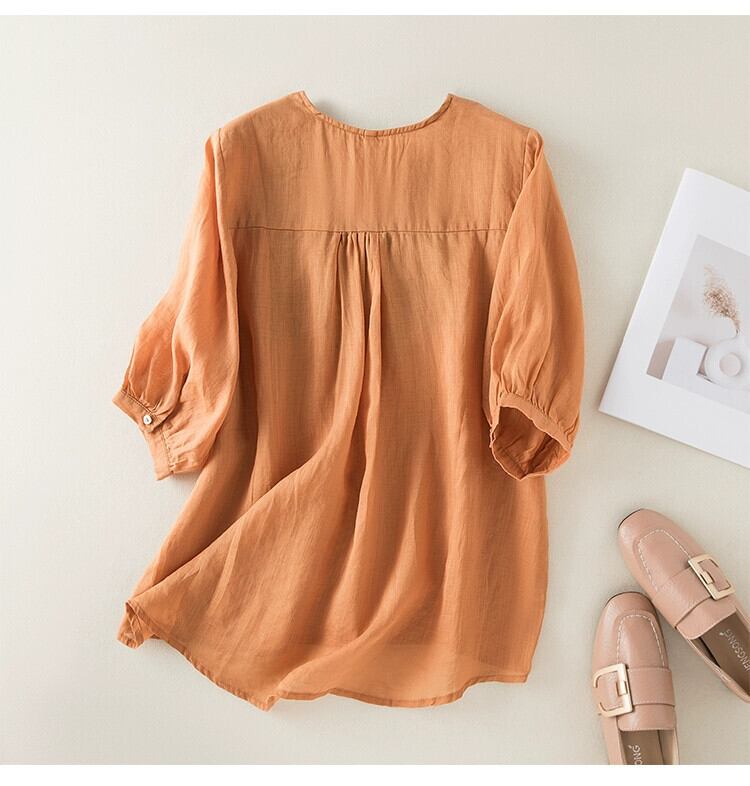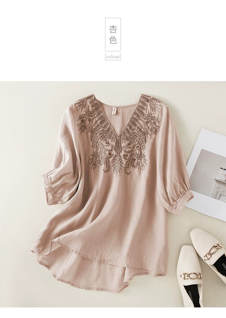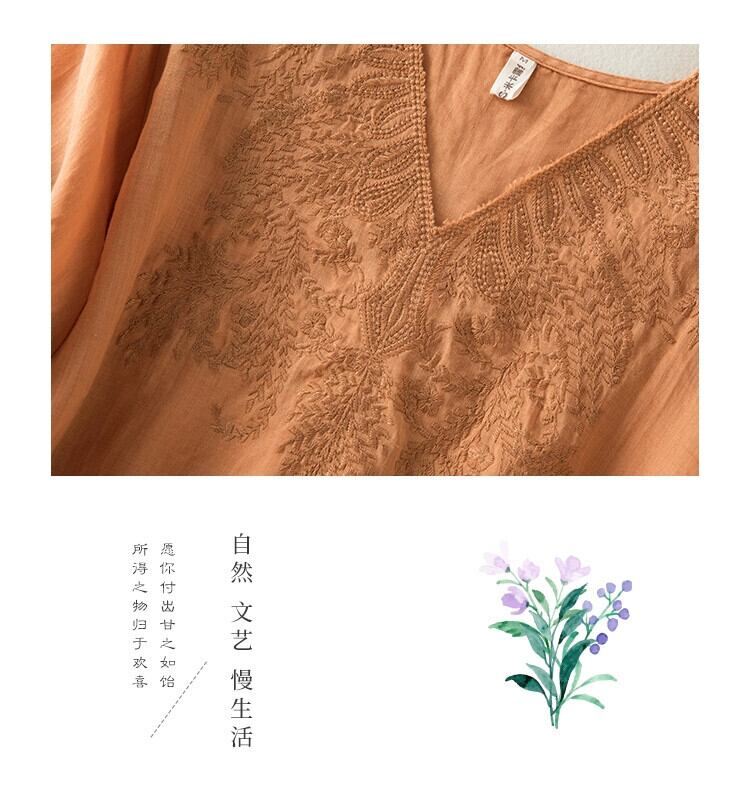 第一線のブランド eign trade カットオフ女性スタイルの刺繍綿とリネン半袖シャツルーズ V ネックラミー薄手のトップ レッド コットン Vネック sine683705574