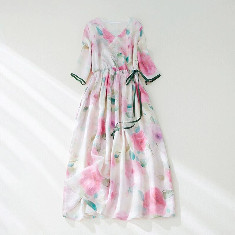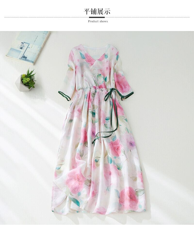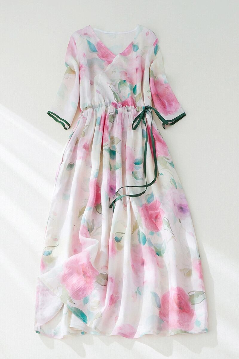 カットラベルショッピングモール除去レディース ese フローラル V ネックラミーフルレングスローブルーズレースアップコットンとリネンのドレス 花柄 Vネック sine65986910788