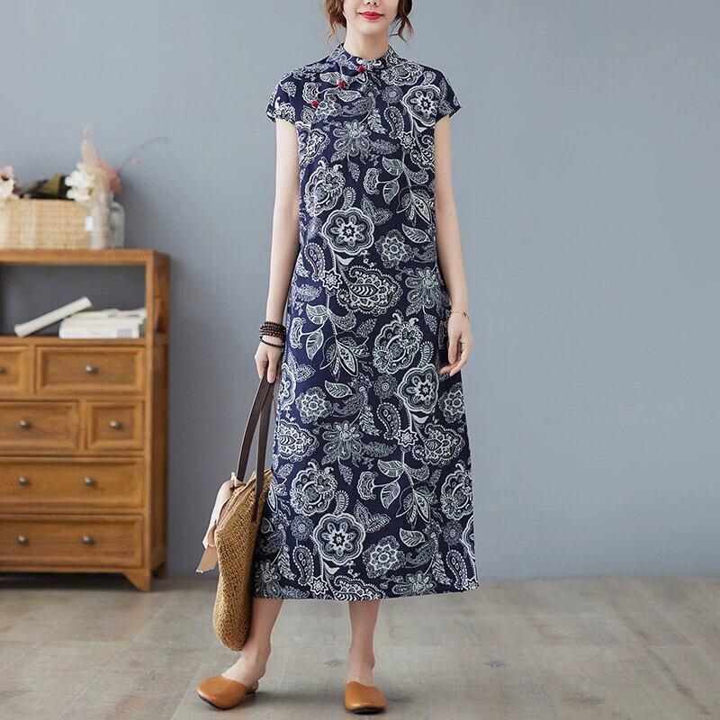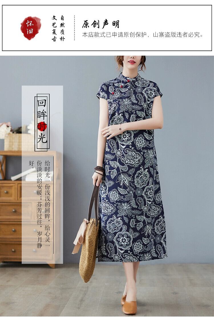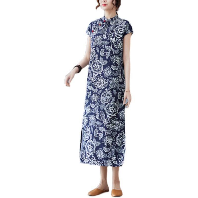 綿とリネンのドレス 2022 夏緩い大きいサイズ中国風斜めラペル水墨画ティードレス改良チャイナドレスラミーロングスカート コットン 大きめサイズ サマー 夏物 sine49431004142