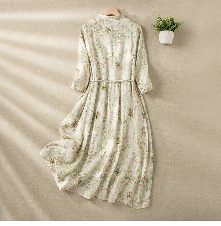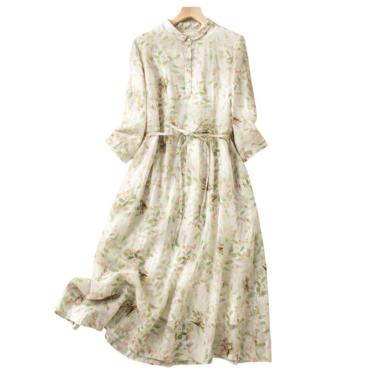 モール撤退最終在庫女性文学花柄ドレス大きいサイズラペルウエスト長袖綿とリネンのミドル丈スカート ロング コットン 大きめサイズ sine5402569783
