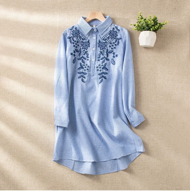 ディスカウントストアの有名カウンター引き出しクリアランスレディースラミー長袖シャツレトロ刺繍ラペルストライプコットンとリネントップ ロング レッド sine53653661251