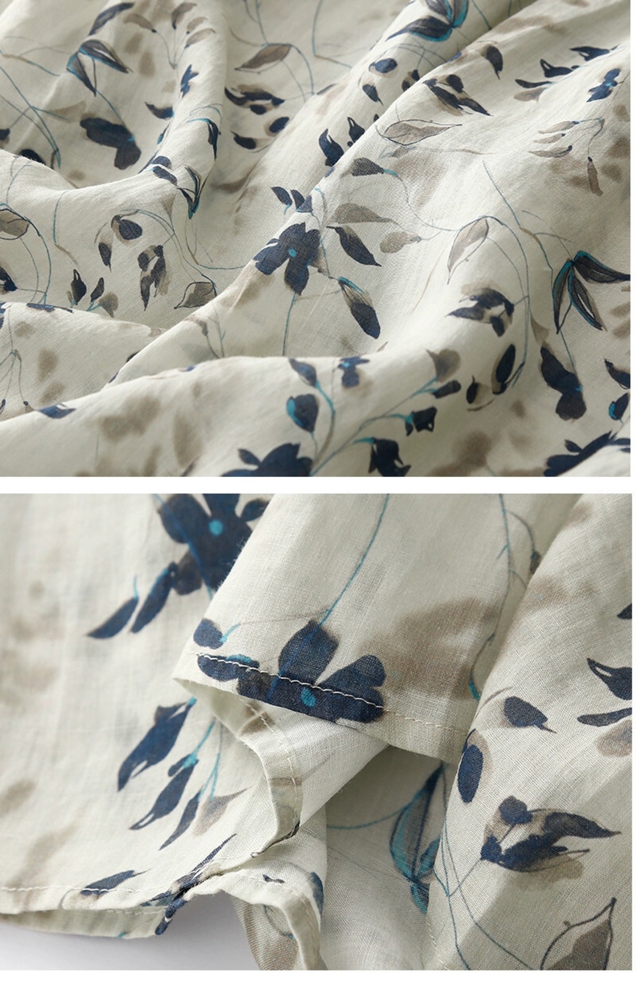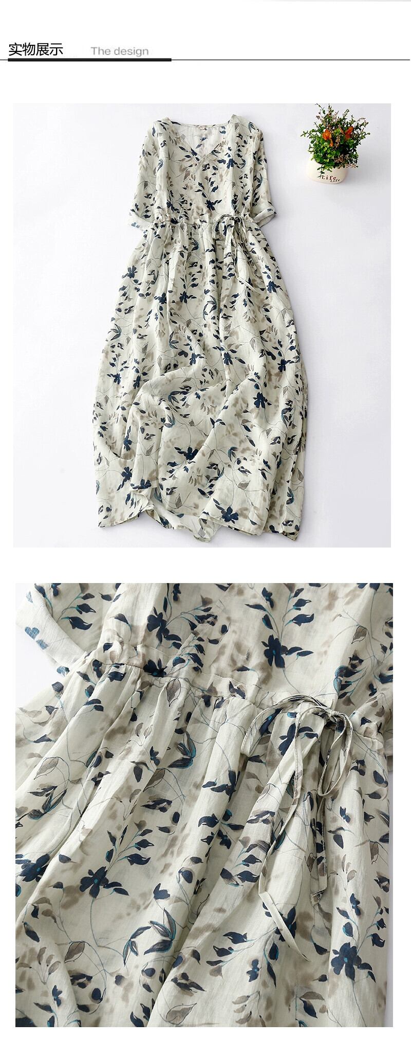 女性用ラミープリントドレス、ウエストタイ、Vネック、ワイドヘムリネンドレス sine70633488359