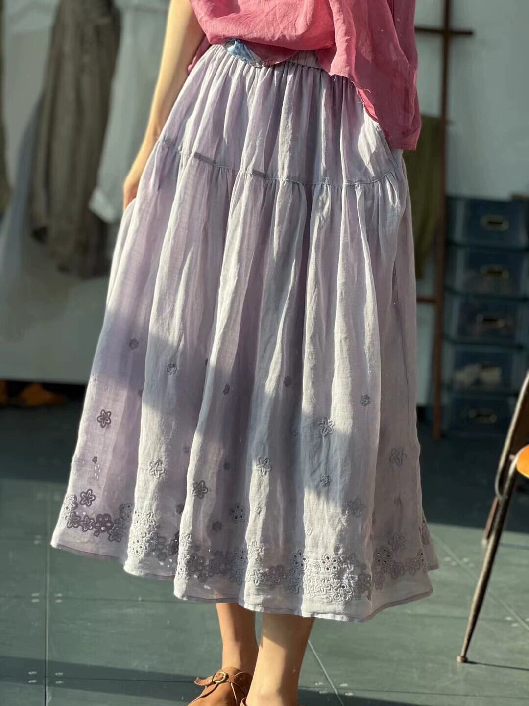 クリアランスブランド牛グッズカウンター最終在庫レディースレトロ刺繍綿麻スカートルーズプリーツリネンAラインロングスカート レッド コットン sine41183453484