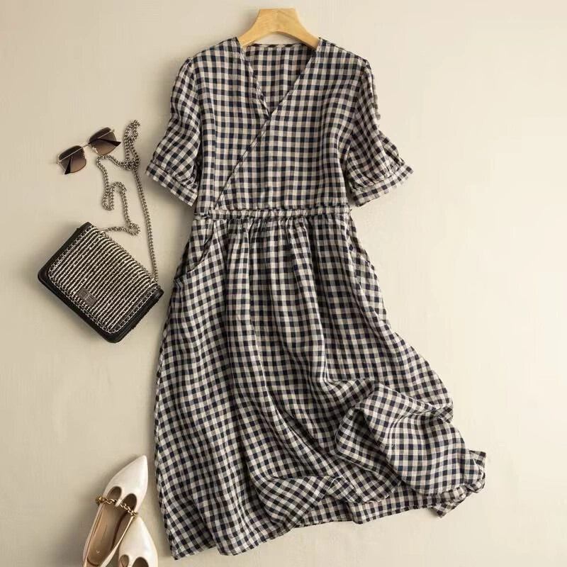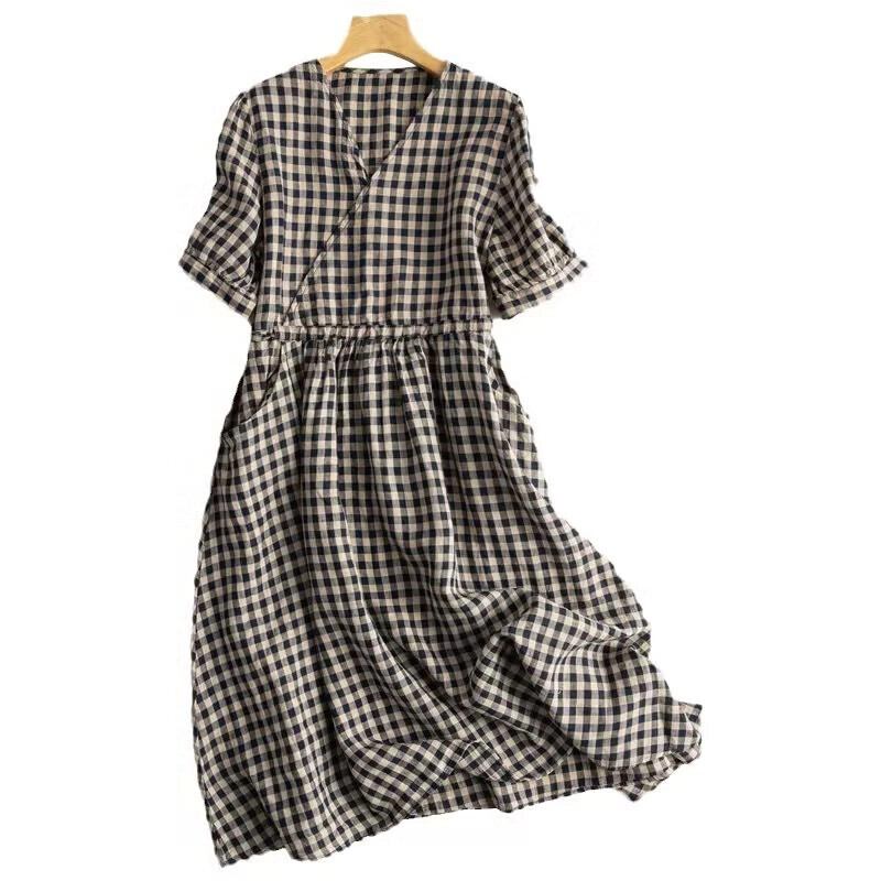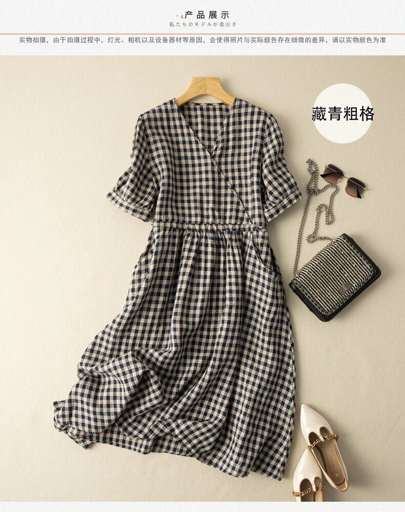 eign trade counter brand テールグッズ レディース ese リネンチェック柄ドレス ルーズ V ネック コットンとリネン 半袖 A ライン スカート 大きな裾付き Vネック Aライン sine48177053816