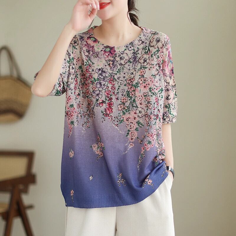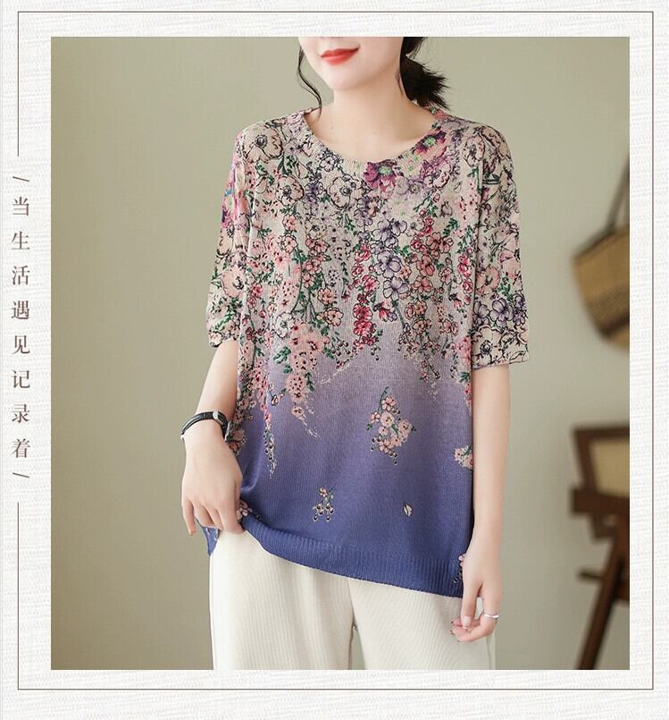 eign trade 輸出ブランドテールグッズ婦人服パッチワーク花柄ニットラウンドネックトップルーズ大きいサイズアイスシルク半袖 Tシャツ 大きめサイズ Oネック sine40853611196