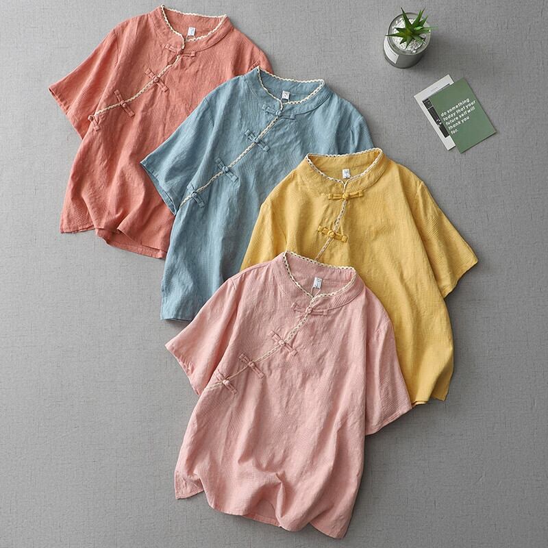 ディスカウント ストア ショッピング モールの女性の中国風の斜めボタン付きラミー トップ ルーズ ジャカード リネン半袖シャツ sine64299274217