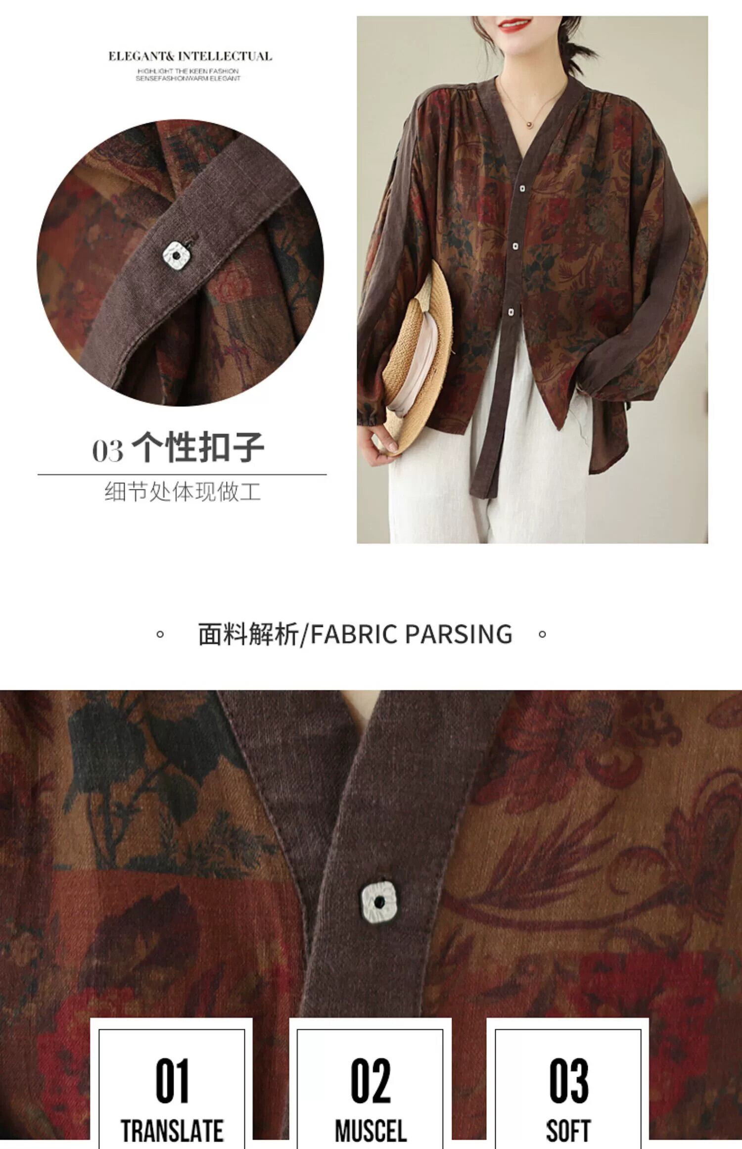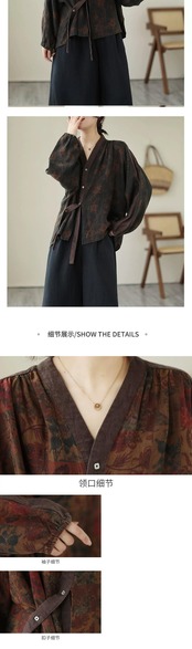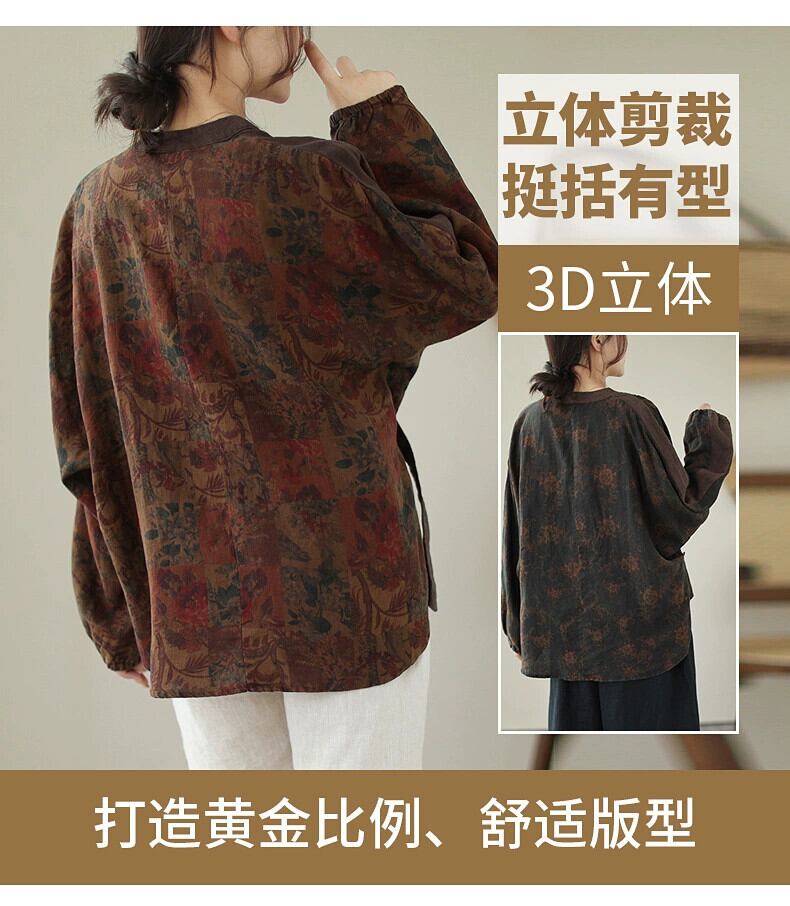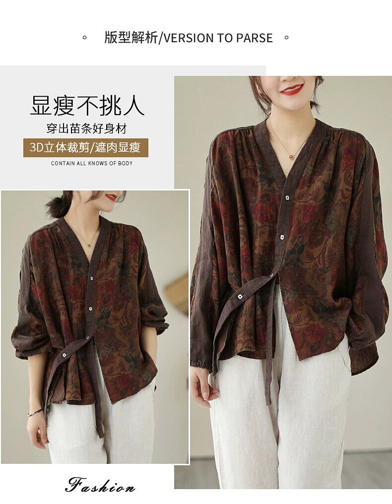 Eign Trade Export Big Tail Goods 撤退レディースレトロ中国風プリントコットンとリネンシャツルーズ V ネックリネントップ夏 サマー 夏物 Vネック sine51720200634