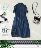 カウンタークリアランス レディース ポロカラー デニムワンピース ゆったり 着痩せ 半袖 Aライン ミモレ丈スカート sine71787439778