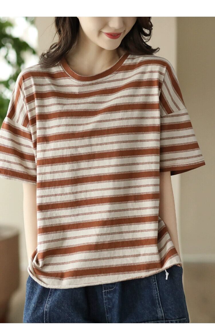 eseとオリジナルのsingle eign tradeの有名なテールグッズコントラストストライプ半袖Tシャツレディースルーズコットンとリネンインナーラウンドネックトップ薄手 Oネック sine64738844245