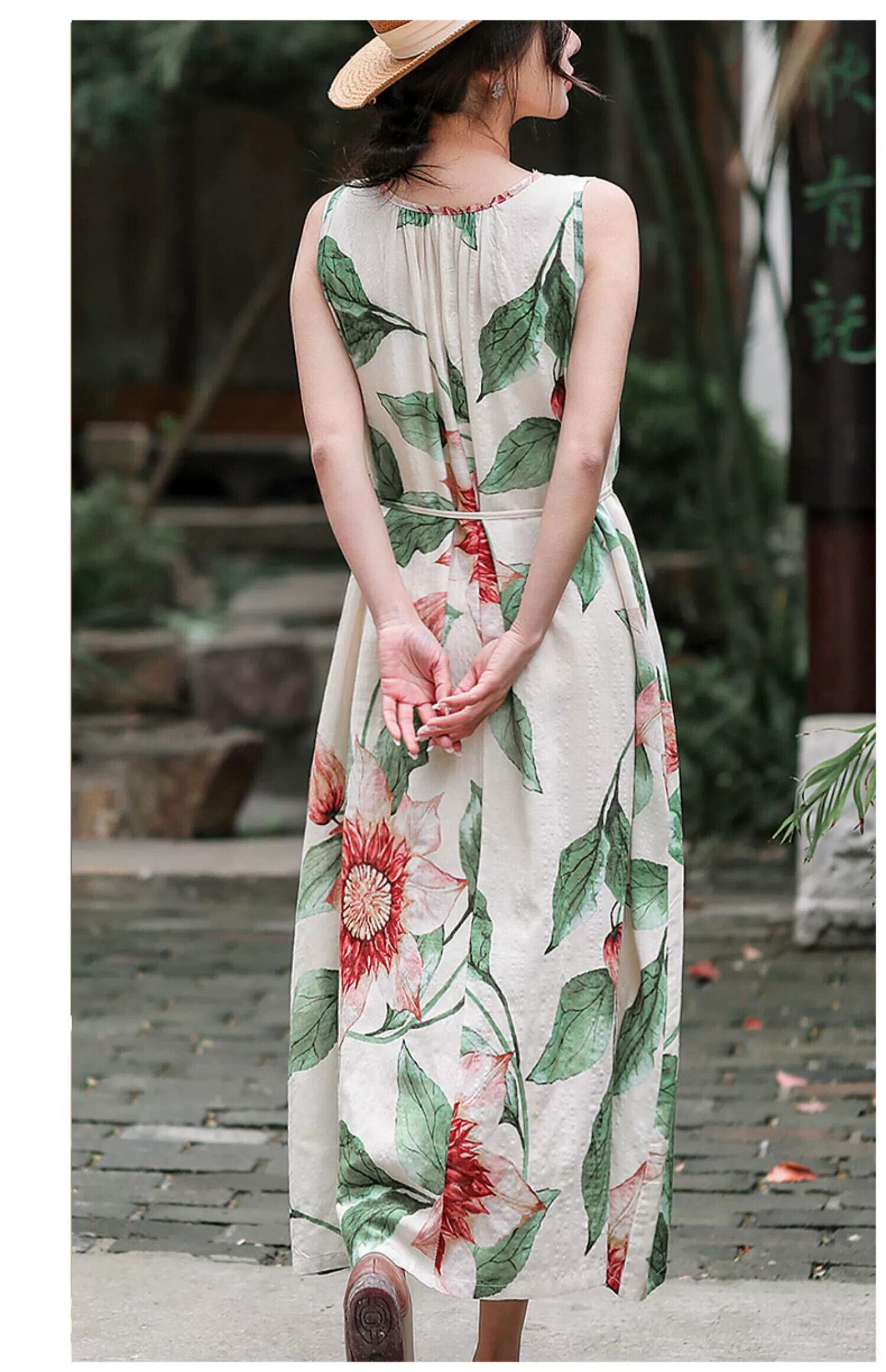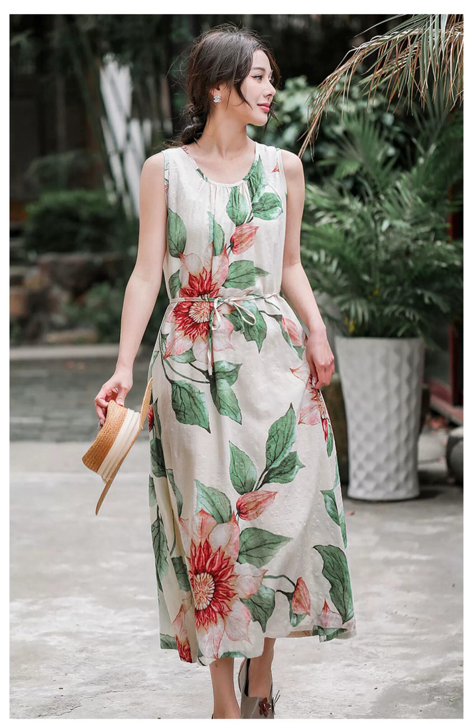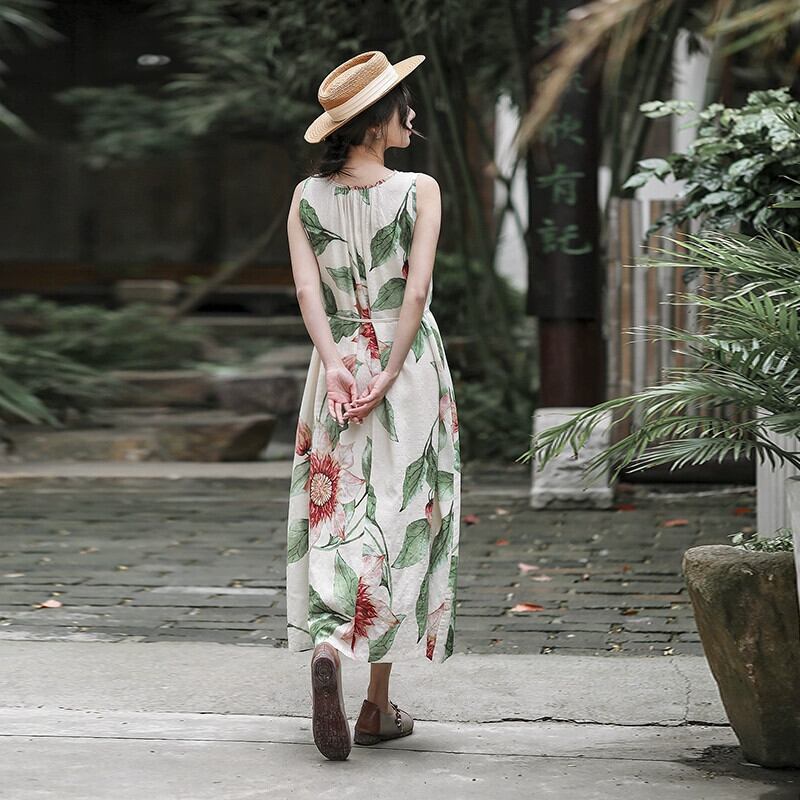 クリアランスブランド牛グッズカウンター最終在庫レディースコットンとリネンプリントサスペンダードレスルーズリネントラベルベストスカート sine71222412837