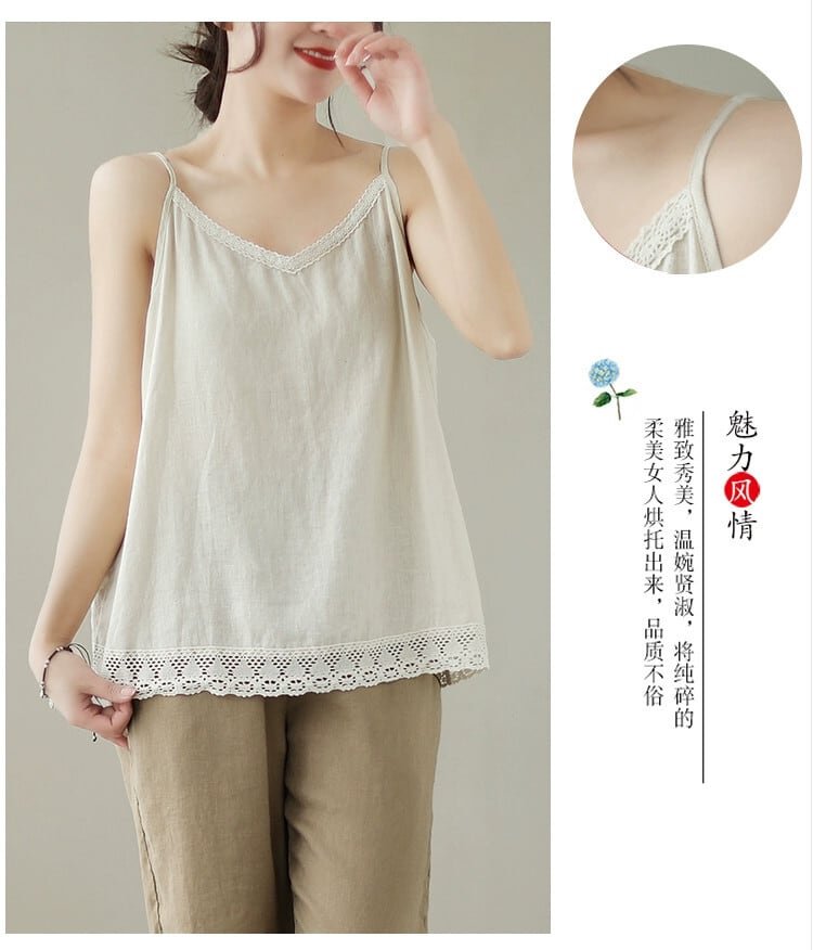 eign trade ese 有名カウンターグッズ レースエッジ リネン キャミソール レディース ゆったり V ネック 綿麻 トップス コットン Vネック sine38349112510