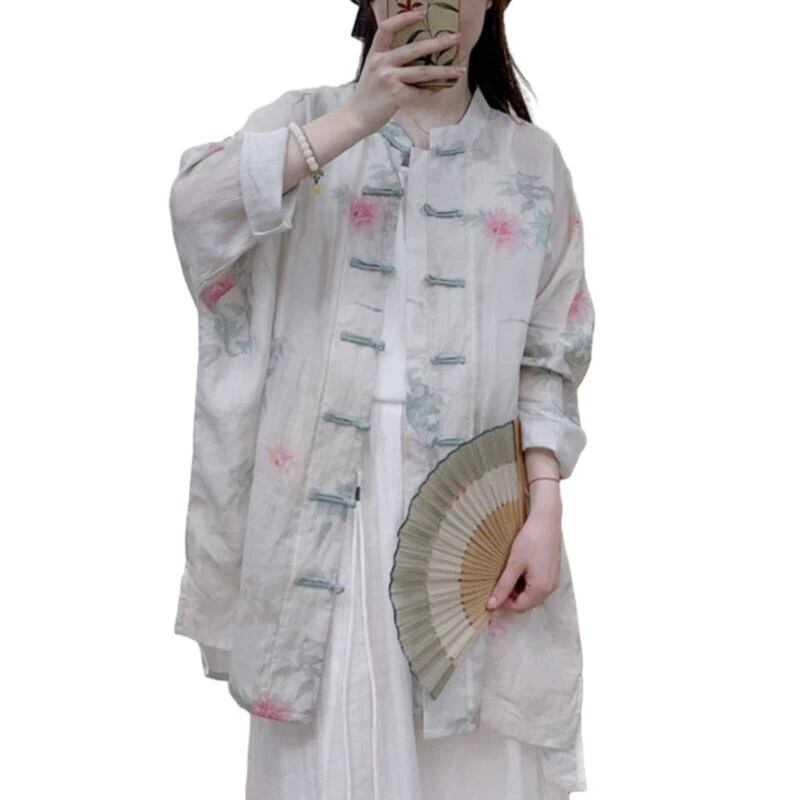カウンタークリアランスクリアランスチャイナスタイルバックルラミーシャツレディースルーズプリントミッドレングスコットンとリネントップ sine62250489618