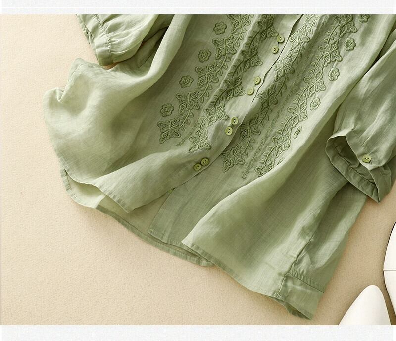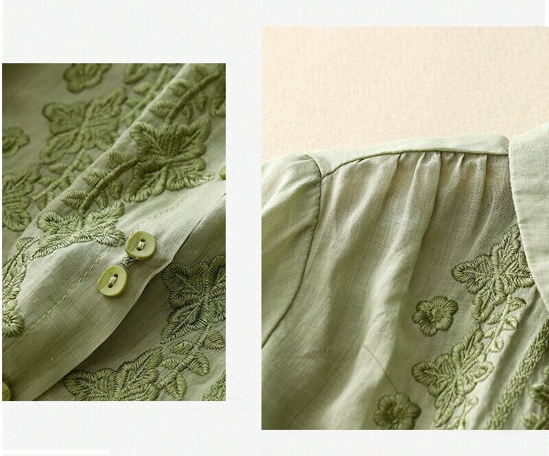 クリアランス漏れ〜既製の女性用レトロ刺繍入りリネン半袖シャツ、ゆったりとした軽いコットンとリネンのカーディガントップ レッド sine6927884996