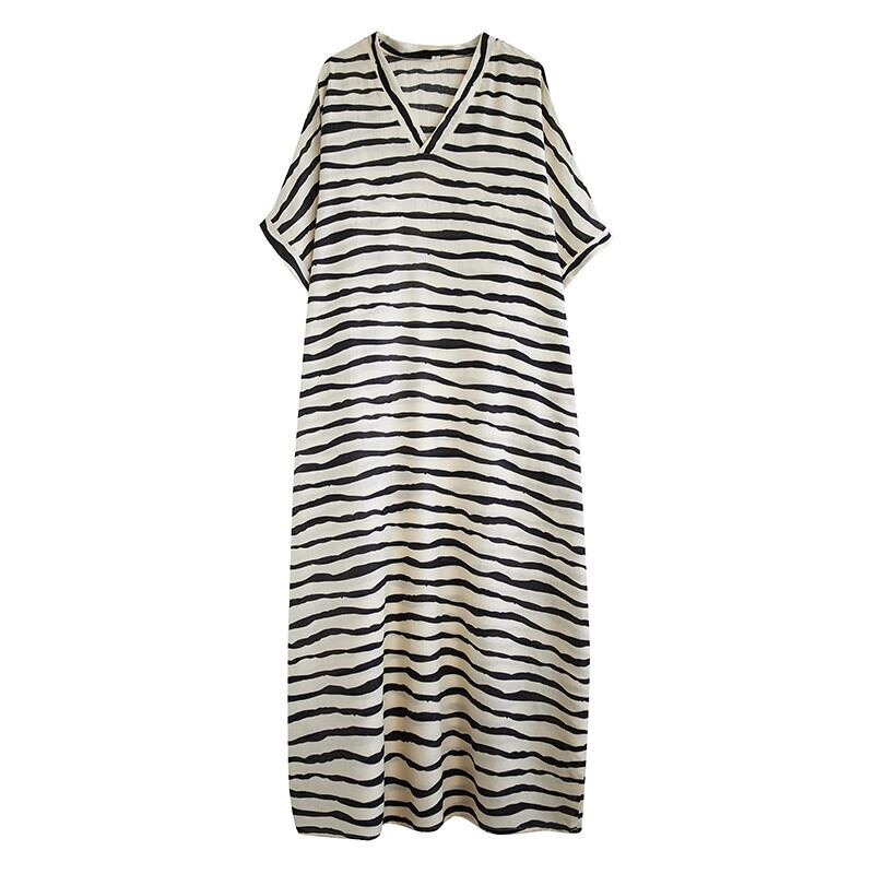 eign trade 激安ブランドテールグッズ eign style 年齢軽減ストライプワンピース ゆったり肉感大きいサイズVネック綿麻ローブ コットン 大きめサイズ sine20269673608