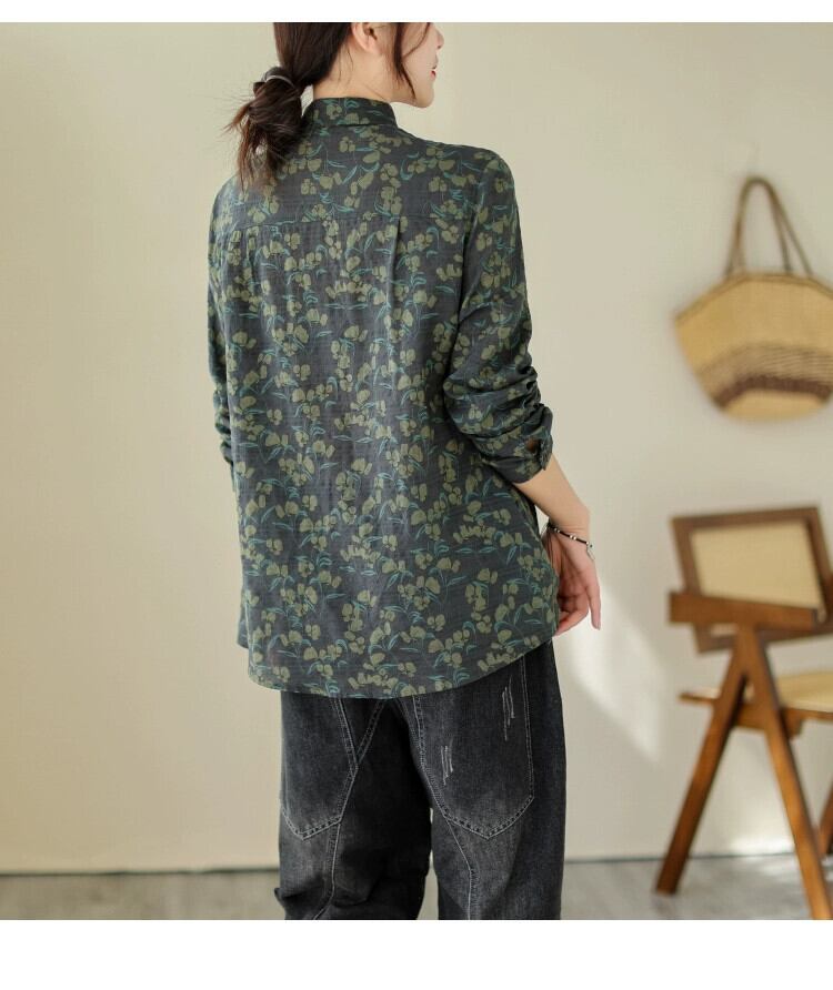 eign trade ese オリジナルハイエンドブランドレトロ花柄ポロカラーシャツ女性のゆったりとした気質の綿と麻の長袖トップ ロング コットン sine91302143744