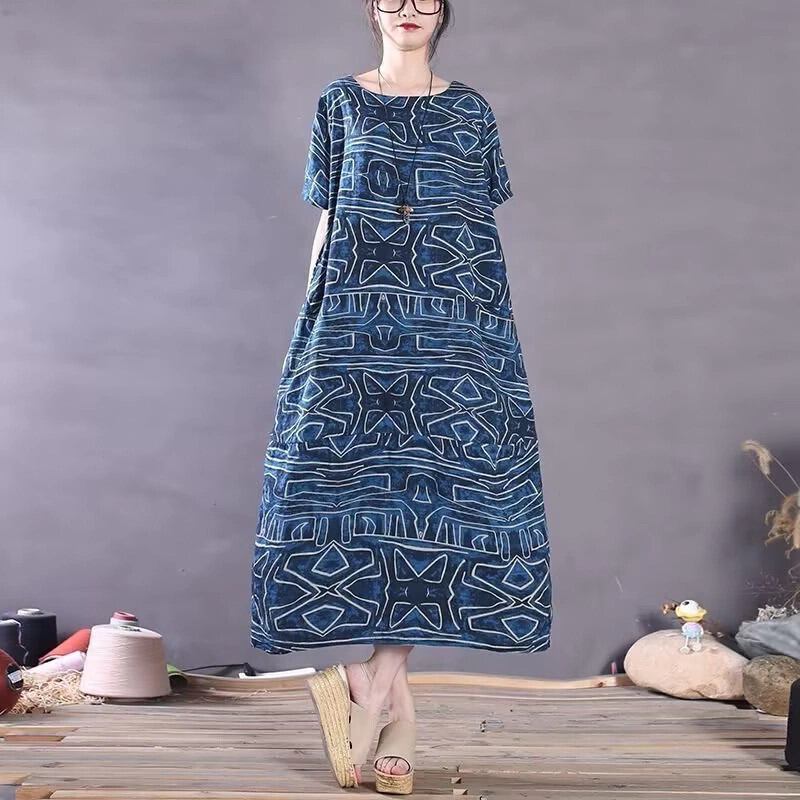eign trade 割引ブランドテールグッズレディースレトロプリント綿麻半袖ドレスルーズリネン膝上 A ラインロングスカート コットン Aライン sine64845740614