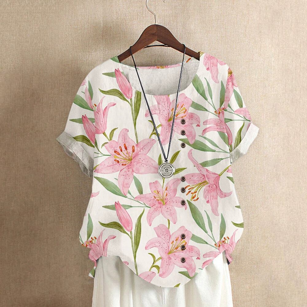 eign trade ese 有名カウンターグッズ コットンとリネンのプリント半袖シャツ トップス ルーズリネン ラウンドネック Tシャツ sine85907183754