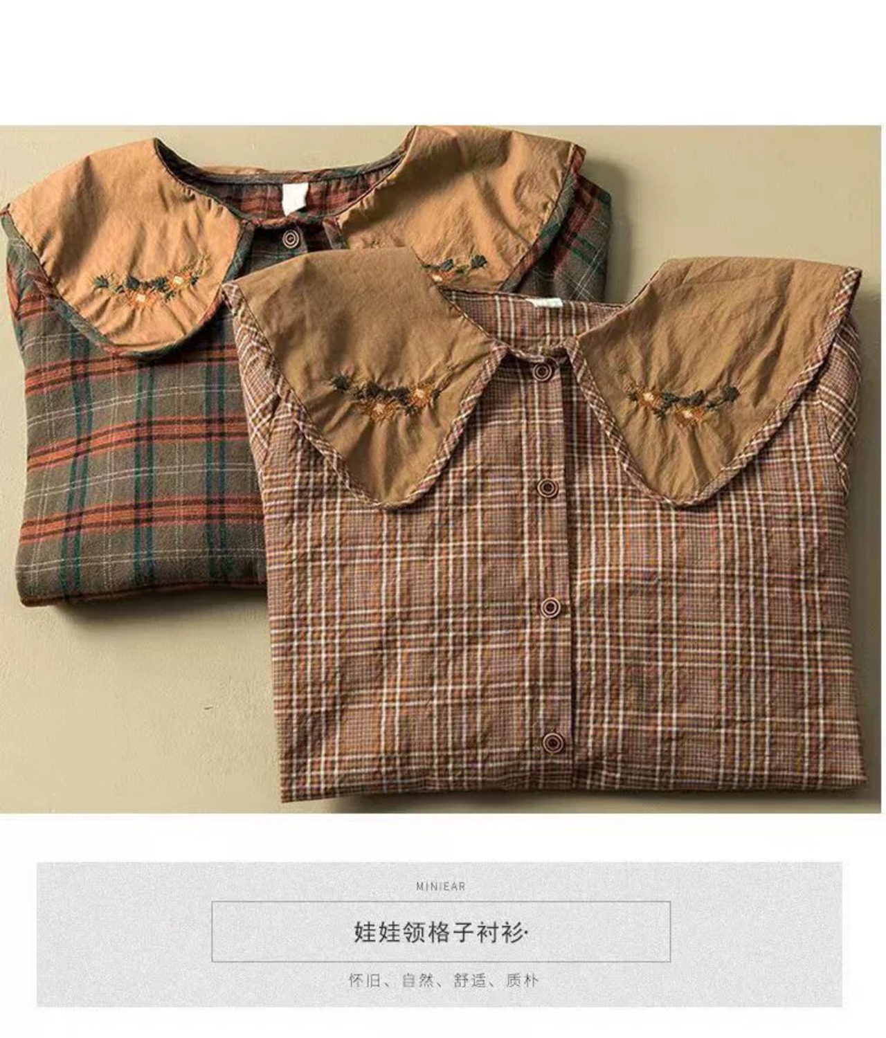 モールビッグネーム撤退最後の在庫レトロ刺繍チェック柄シャツ女性のルーズカジュアルカーディガン人形襟トップ レッド sine73484762975