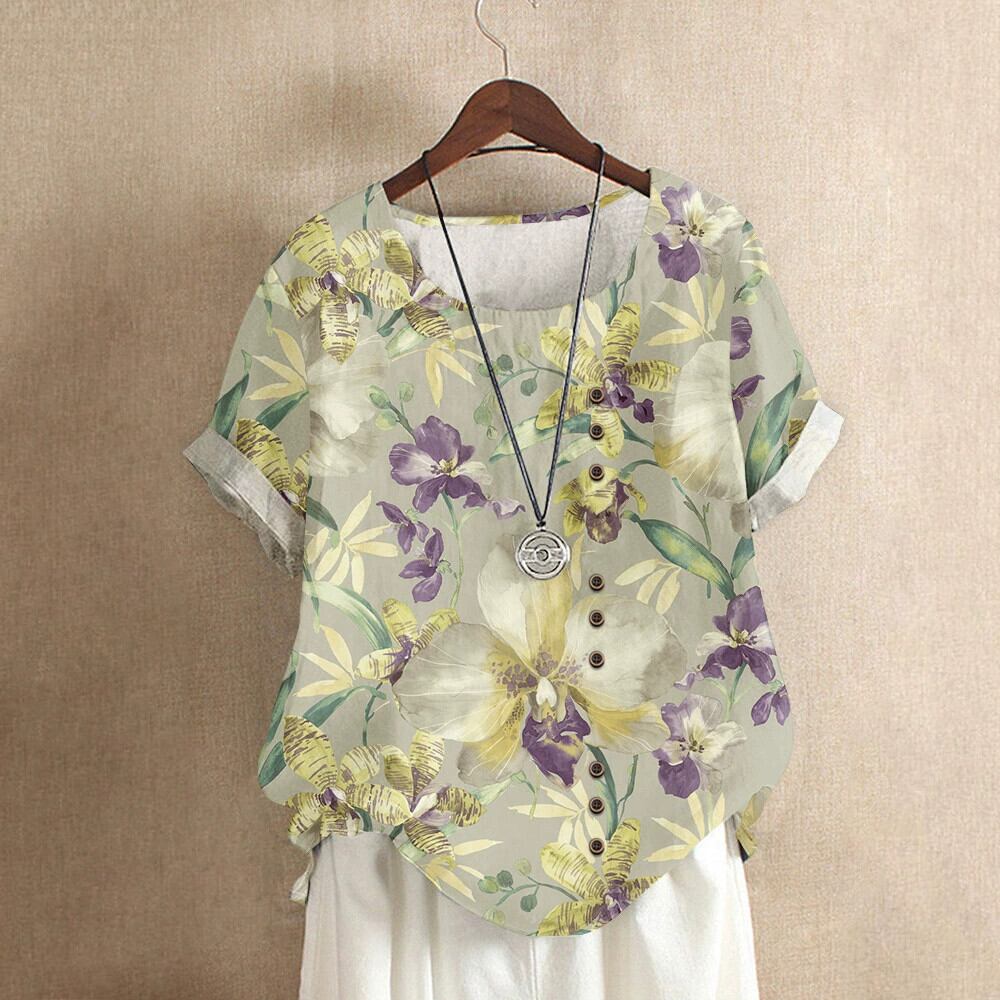 ディスカウントストアショッピングモール撤退レディースレトロプリントコットンとリネンシャツTシャツカジュアル多目的リネン半袖トップ sine9017431819