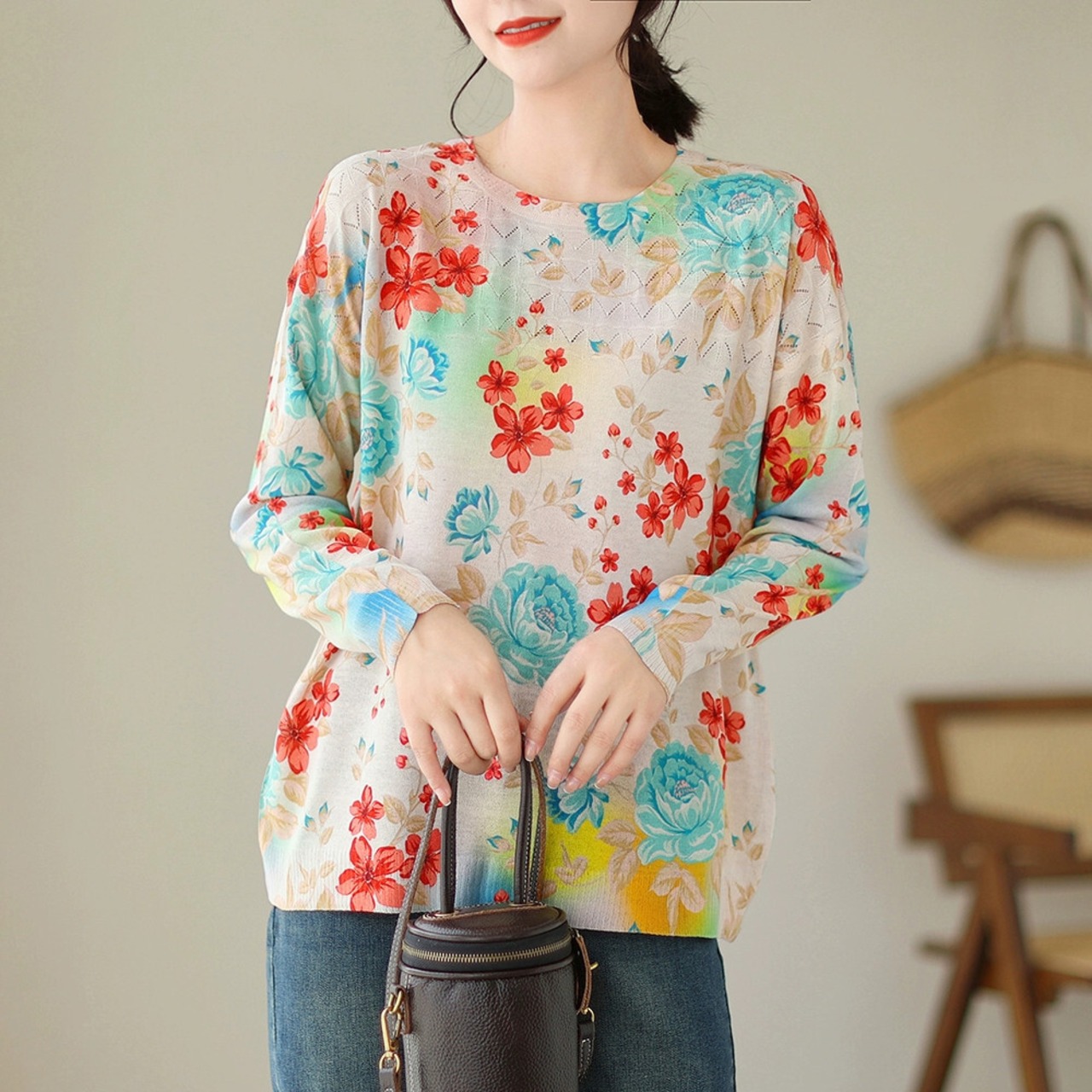 エド牛クリアランス、高級テールグッズ、レトロプリントセーター、セーターレディース、ルーズカジュアルインナーラウンドネックトップス Oネック sine7766348565