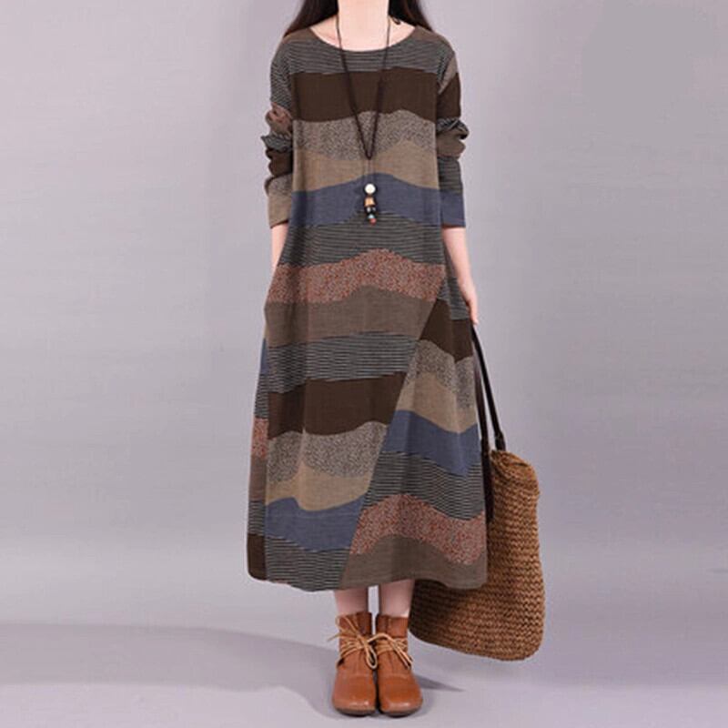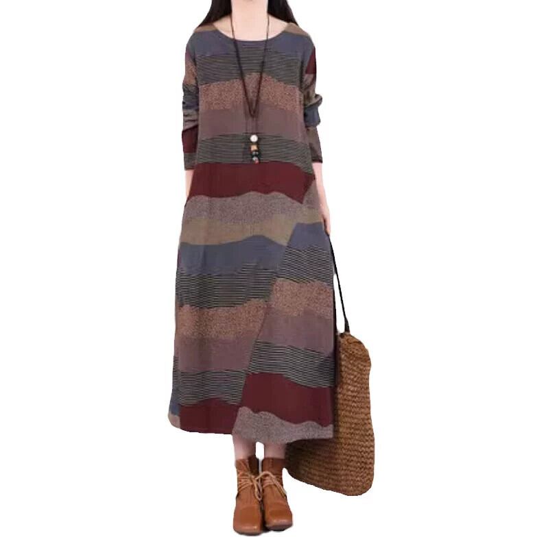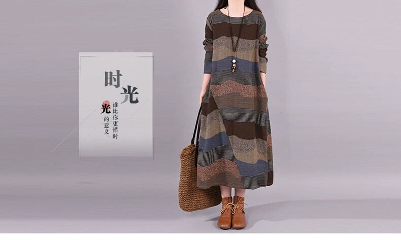 第一線のブランド eign trade 最後の在庫レトロストライプ綿とリネンのドレスの女性の秋のルーズリネンラウンドネックロングスカート コットン オータム 秋物 Oネック sine37301835290