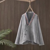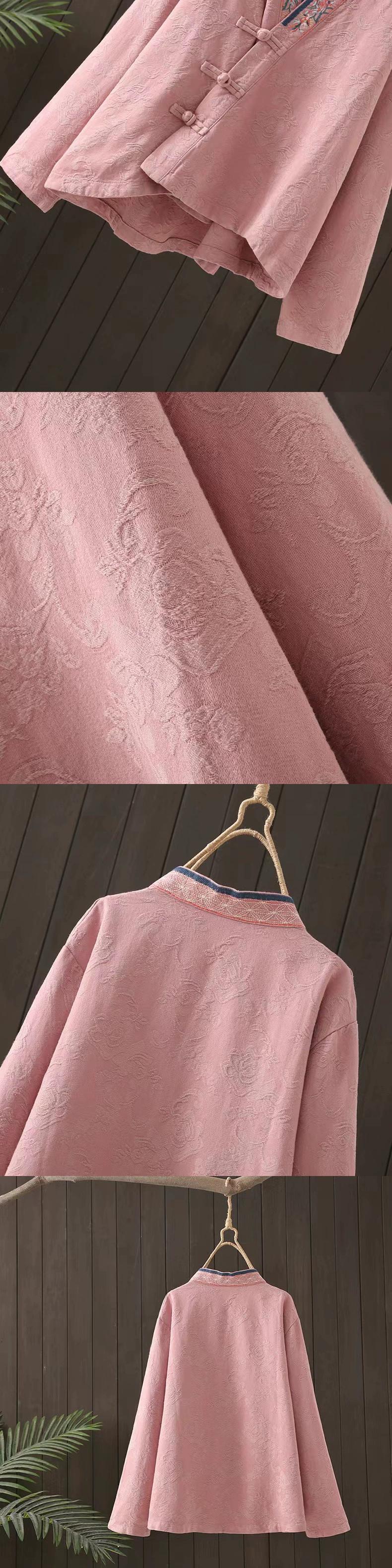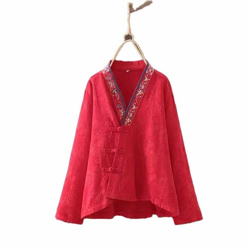 中国風の V ネック刺繍綿とリネンのシャツ、春と秋のレトロな中国風の改善された漢服プレート ボタン リネン カーディガン トップ レッド コットン スプリング 春物 オータム 秋物 Vネック sine77467057572