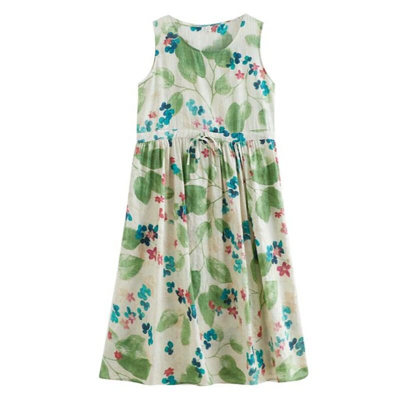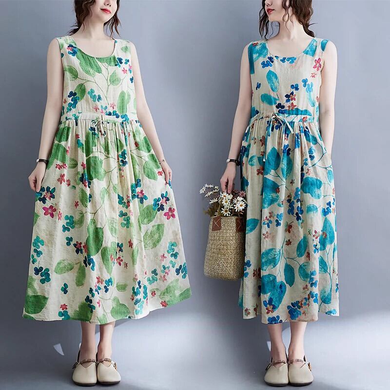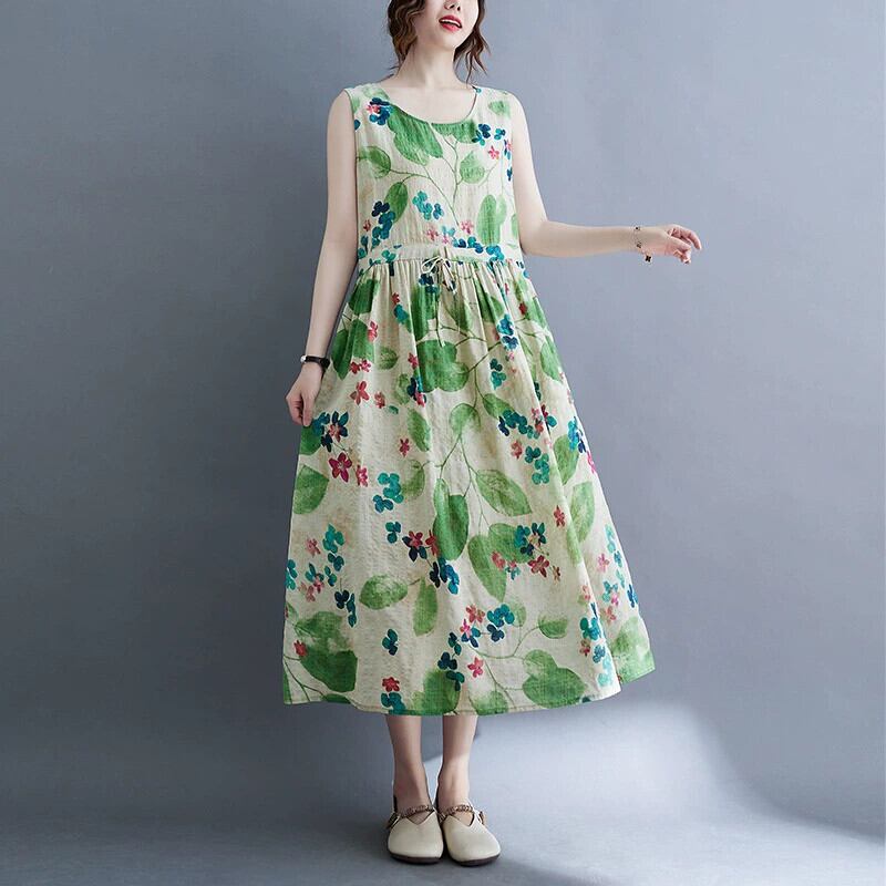 やや太いmm綿とリネンドレス夏緩い大きいサイズレトロ花柄ハイウエスト大きな裾ノースリーブリネンベストロングスカート ハイウェスト コットン 大きめサイズ サマー 夏物 sine23219133128